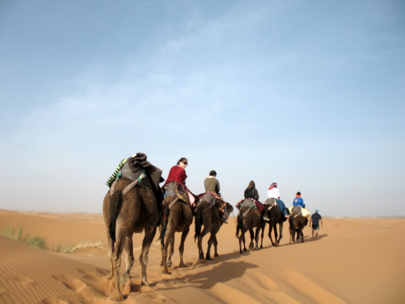 D’autres programmes de trois à quatre jours au départ toujours de Marrakech en prenons la route en direction de Skoura et Kalaa M’gouna la ville des roses, en traversant les villages berbères, puis on empruntant la piste qui nous conduise aux Gorges du Dades à Boulmane. Nuitée dans les Gorges en maison d’hôte. Puis départ vers Tinghir, visite des Gorges de Todra… Continuation vers Merzouga en empruntant la route d’Erfoud célèbre pour ses marbres fossilisés, passage par Rissani ancienne capitale de Tafilalet une palmeraie immense irriguée par le Rhesis et oueds ziz, entouré par le désert. Direction au pied des dunes Merzouga et partons en dromadaire (1h30) pour le bivouac situé au milieu de l’Erg Chebbi le seul champ de dune ou l’erg au Sahara Marocain.